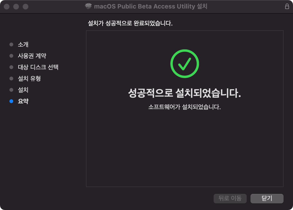 macOS 공개 베타 프로그램 다운로드가 완료되면 [계속] 버튼을 클릭하여 설치를 진행합니다.