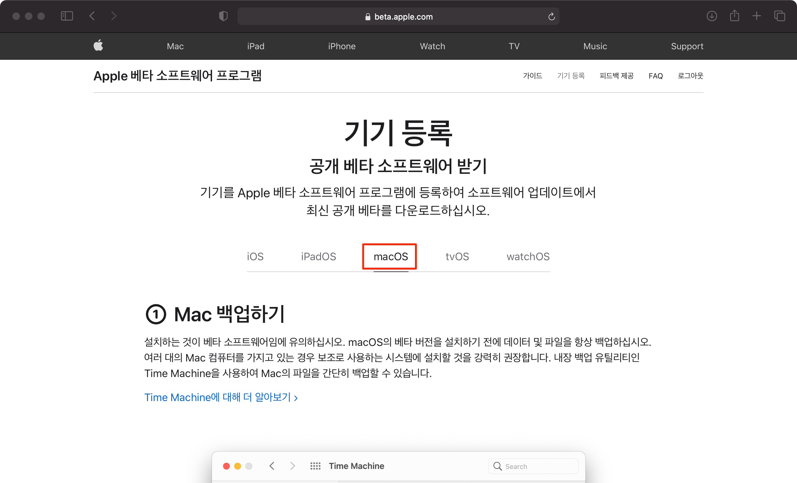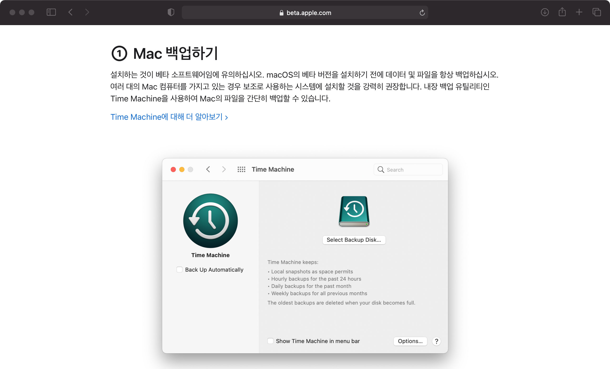 우선 현재 맥을 백업해야 합니다. 백업은 필수 사항은 아니지만, 권장 사항입니다. 만의 하나 설치를 하다 문제가 발생할 수 있으므로 타임머신 등으로 백업을 하는 것이 좋습니다.