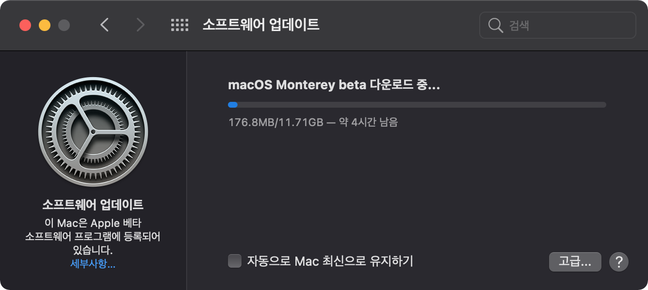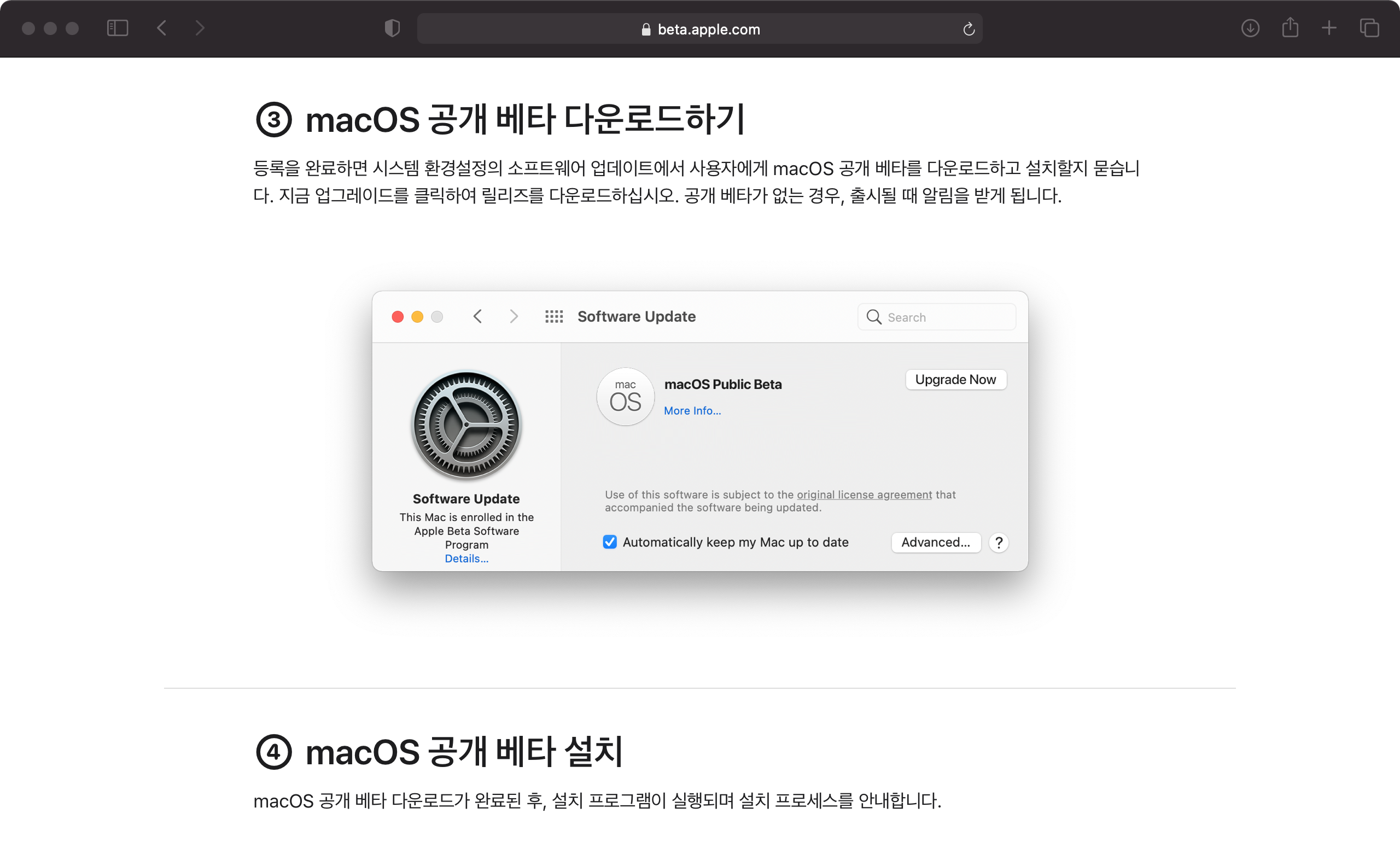 [macOS 공개 베타 액세스 유틸리티]를 설치하면 자동으로 환경설정의 소프트웨어 업데이트에서 사용자에게 mac 공개 베타로 업그레이드 할지를 묻습니다.