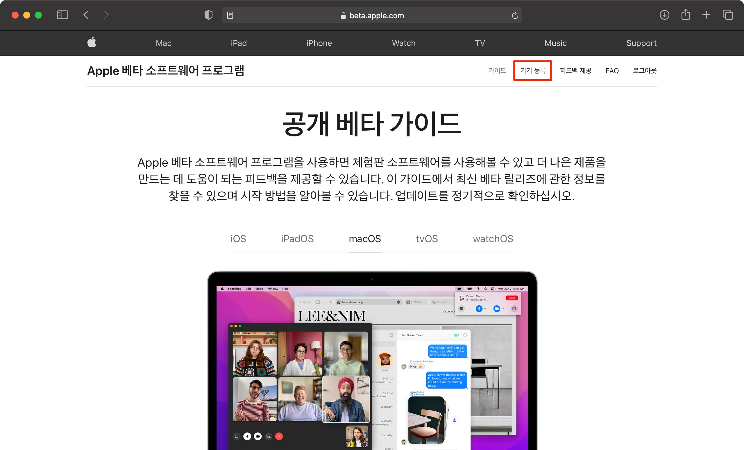 베타 프로그램을 사용할 기기를 등록해야 합니다. [기기 등록]을 클릭합니다.