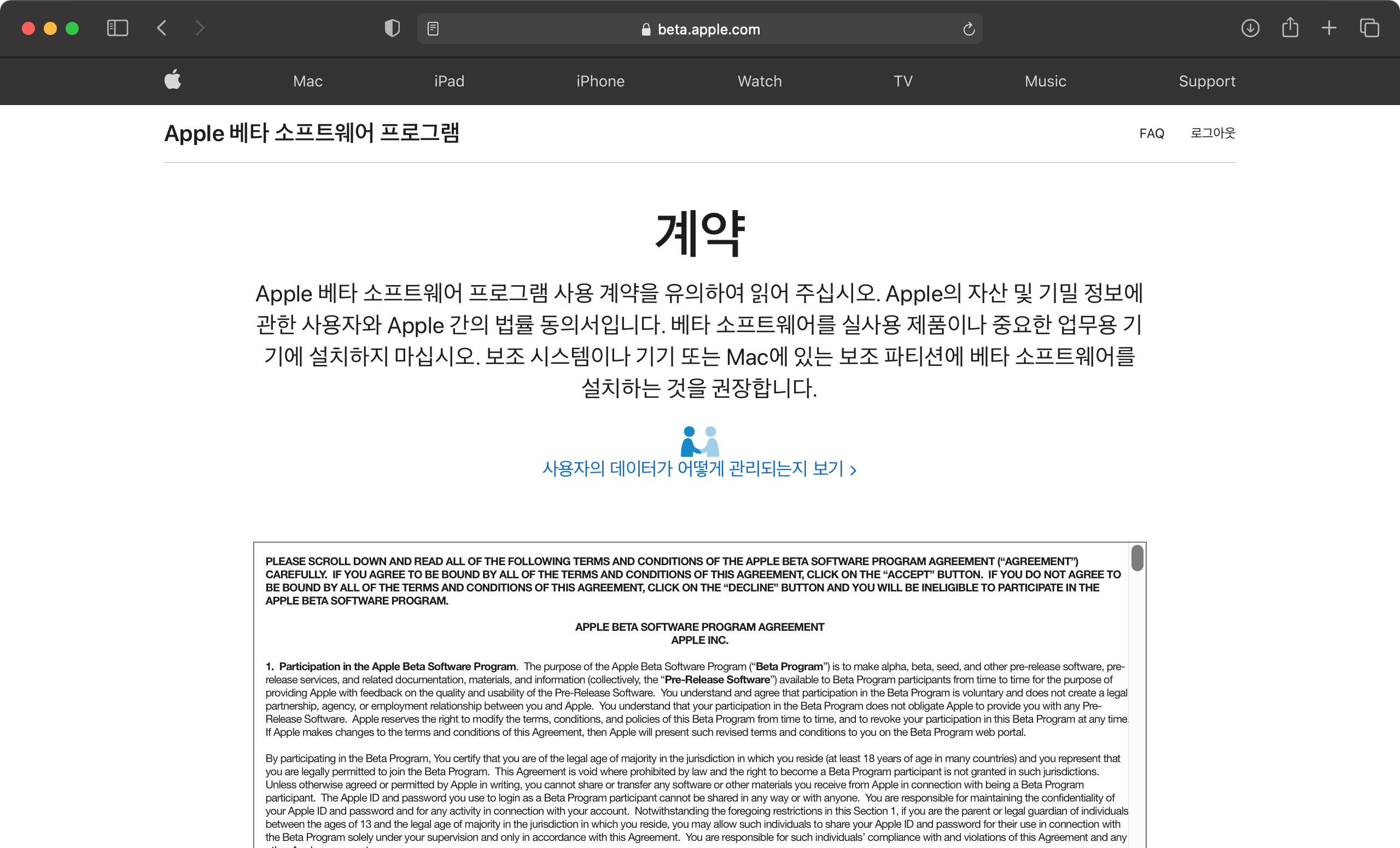 베타 소프트웨어 프로그램에 처음 방문하시는 분은 다음과 같은 계약 사항을 읽고 동의를 해야 합니다. 맨 아래로 스크롤하여 [동의] 버튼을 클릭합니다.