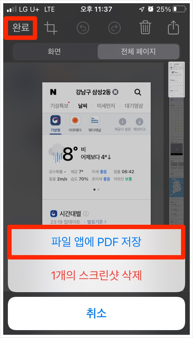 [완료] 버튼을 클릭한 후 [파일 앱에 PDF 저장] 버튼을 클릭합니다.