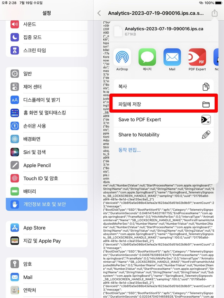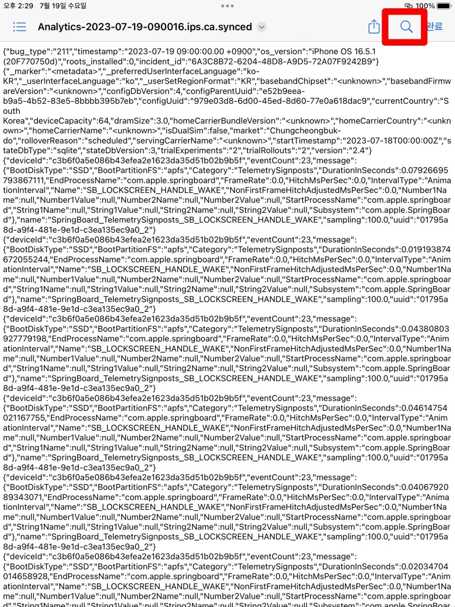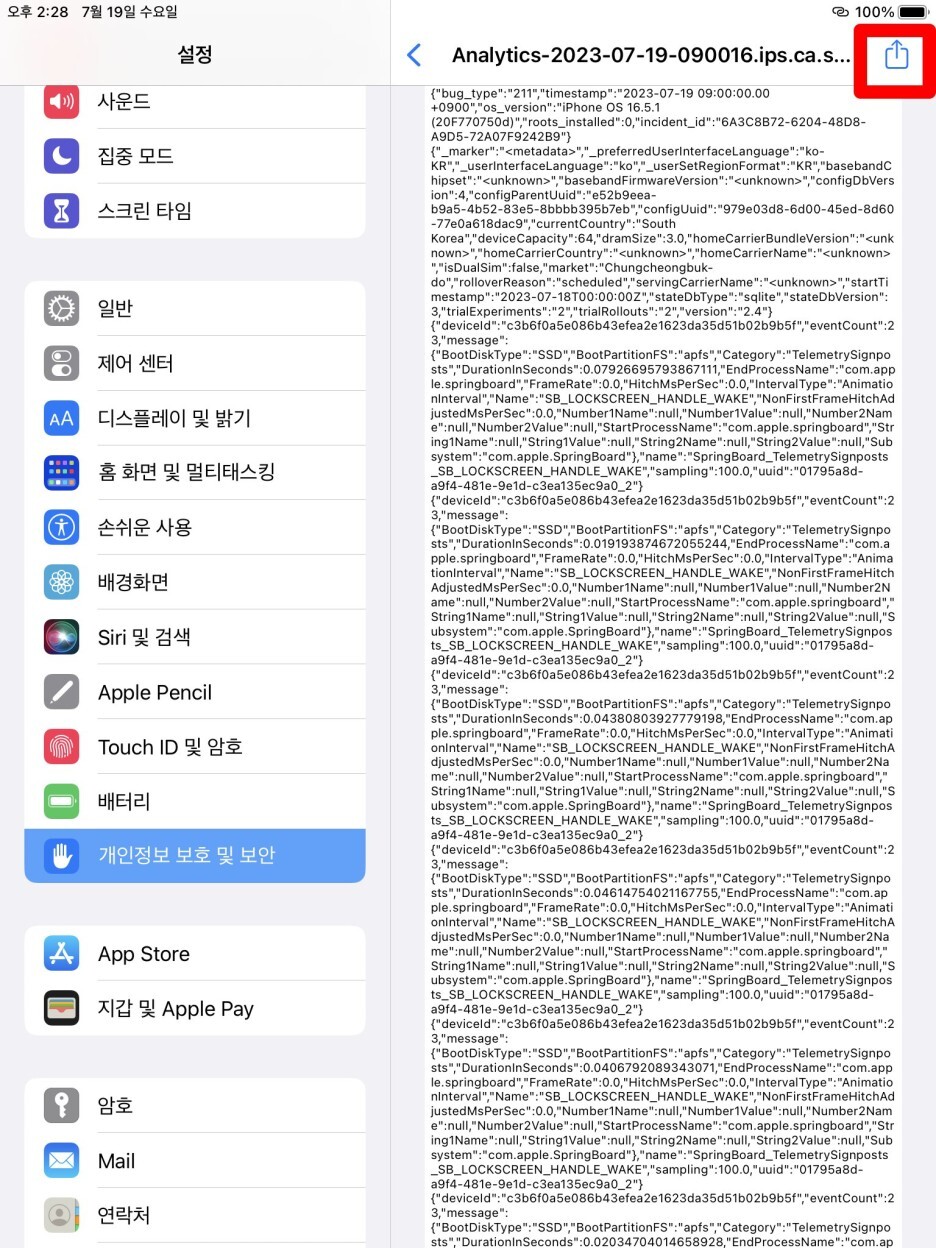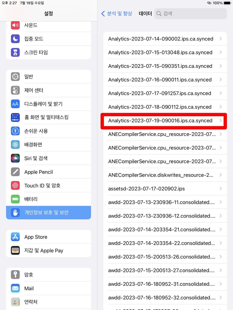 여기서 Analytics로 시작하는 데이터를 확인하시면 됩니다. 아이패드의 기종이나 iPadOS 버전에 따라 log-aggregated로 시작되는 데이터로 생성되기도 합니다.(저 같은 경우는 log-aggregated로 알고 기다리고 있는데 몇일이 지나도 생성이 안되어서 구글링을 해보니 Analytics를 확인해야 했습니다.)