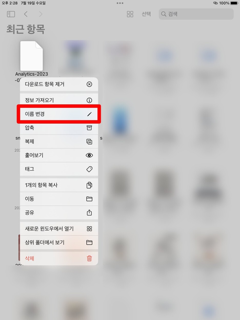 분석 파일을 꾹 누르면 다음과 같은 메뉴가 나오고 여기서 [이름 변경]을 선택합니다.