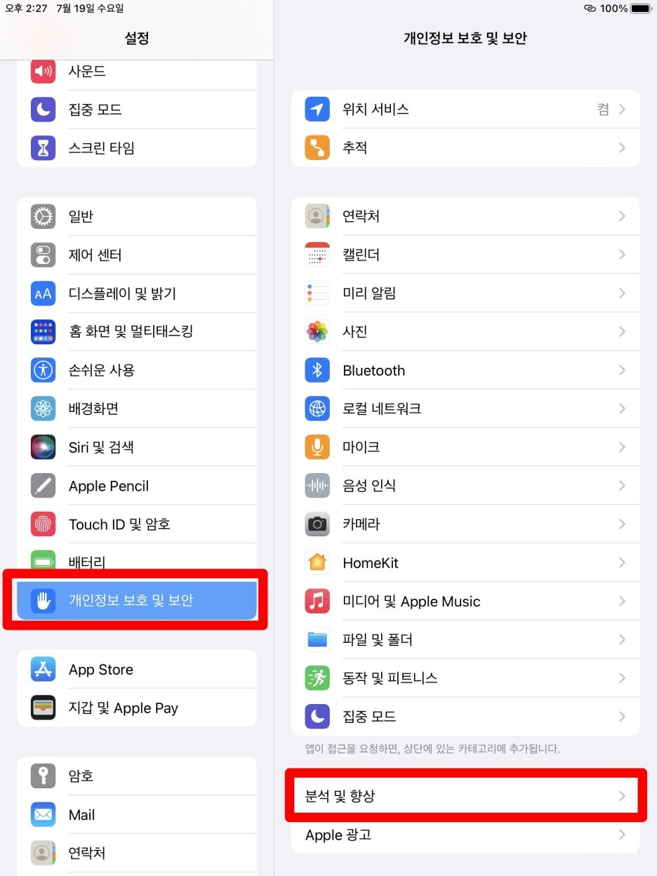 여기서 [iPad 분석 공유]를 활성화 시킵니다.