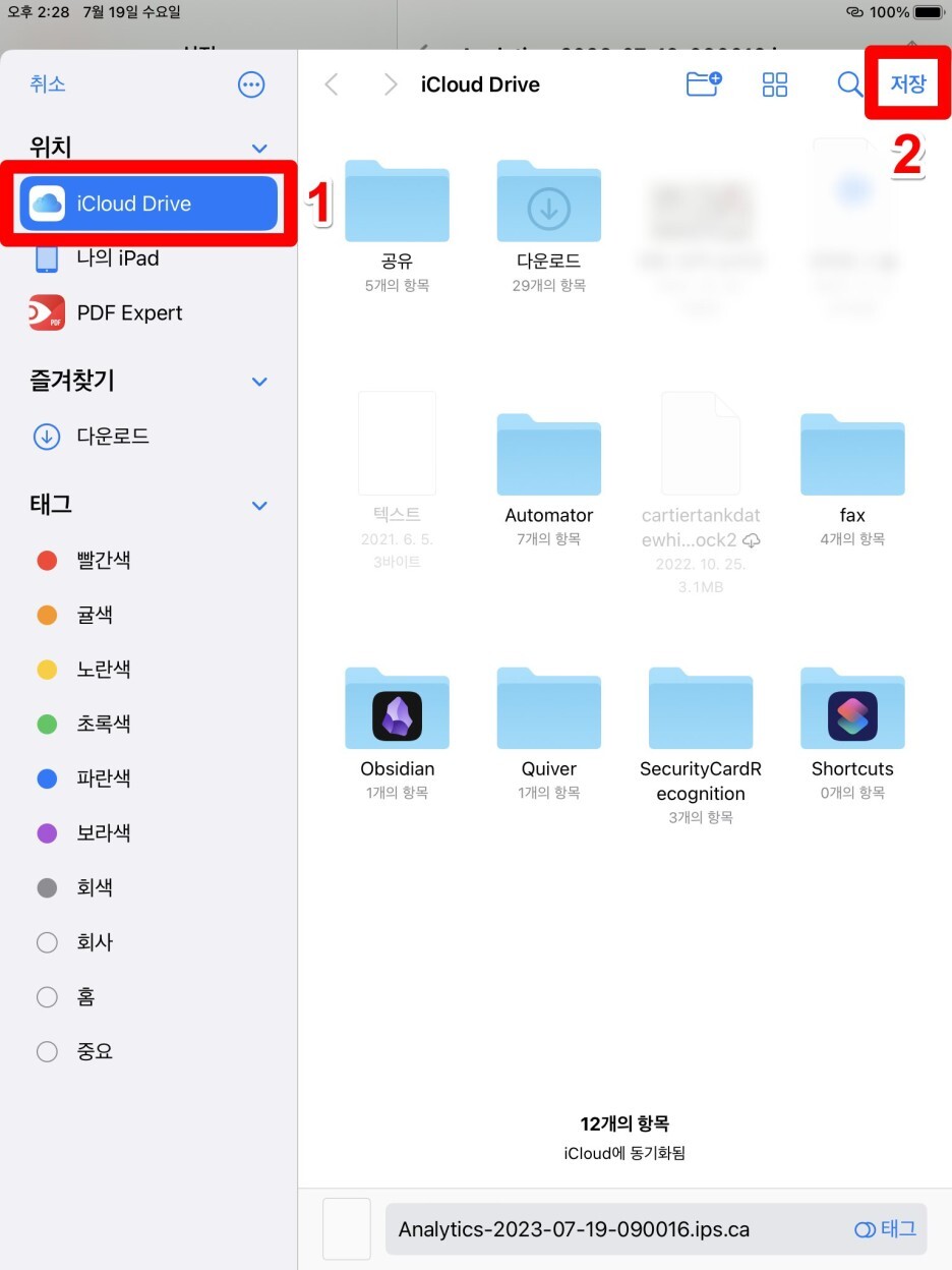 저장할 위치를 선택합니다. [icloud Drive] 또는 [나의 iPad]을 선택하고 [저장] 버튼을 클릭합니다.