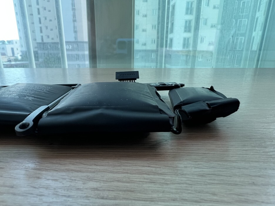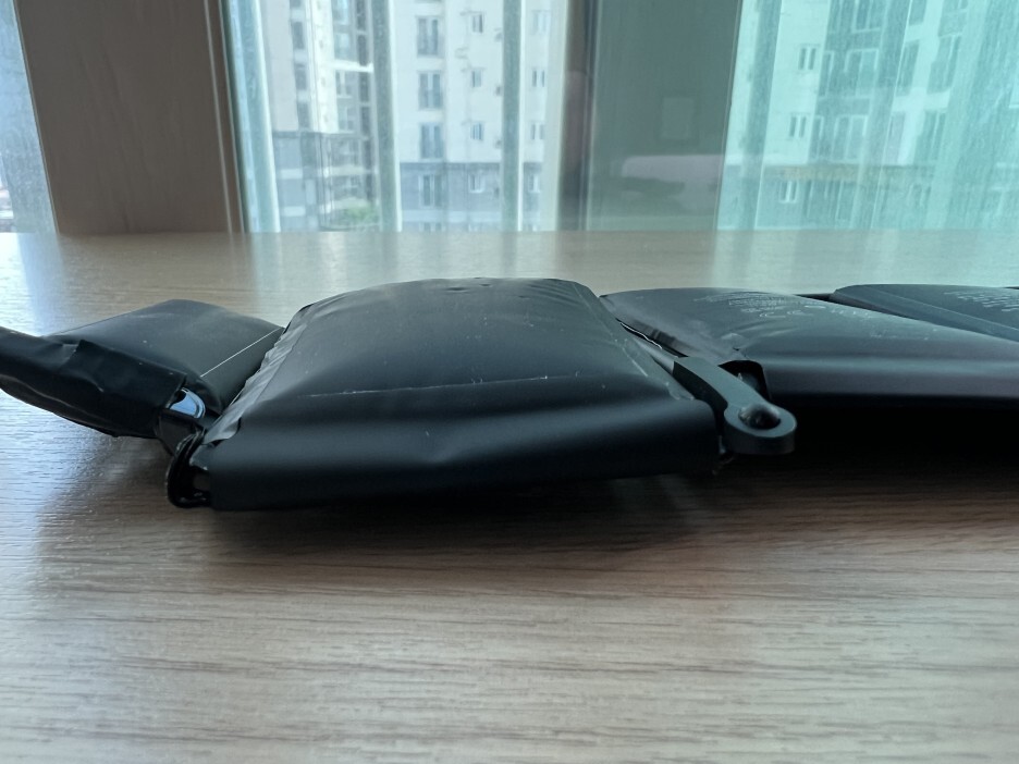 분리된 배터리의 모습입니다. 양쪽 끝부분의 배터리가 많이 부풀어 올라 있습니다.