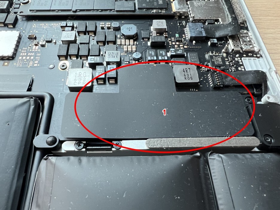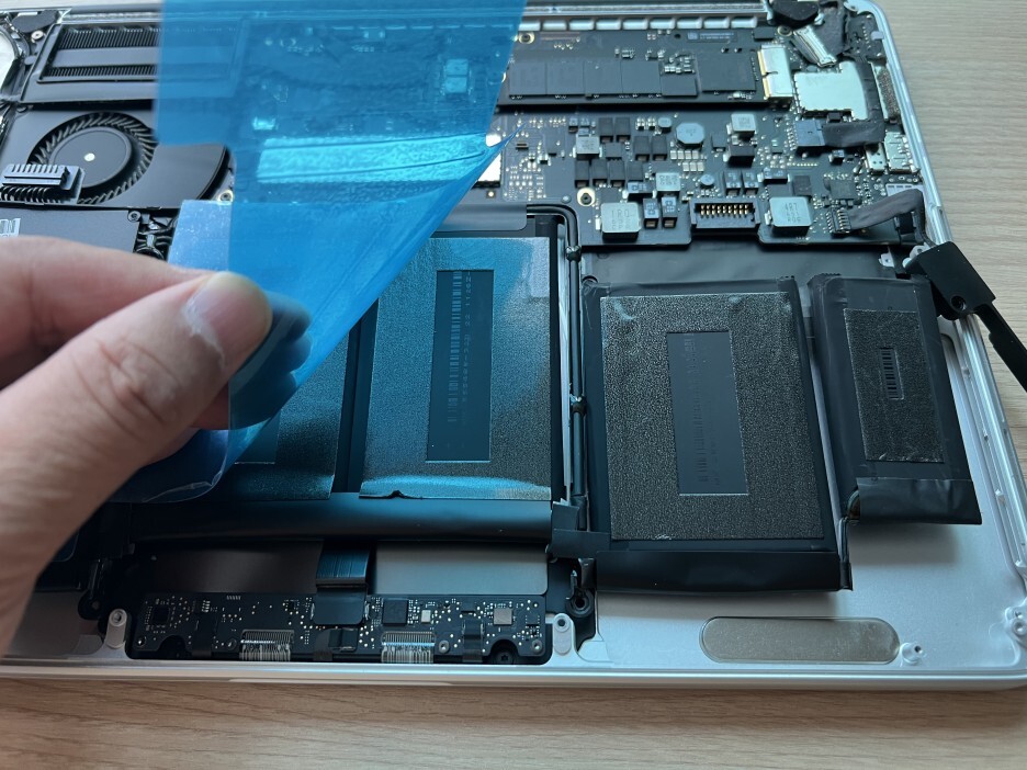1) 우선 파란색 플라스틱 커버가 붙어있는 부분을 위로 하고 배터리를 맥북에 위치시킵니다. (지금은 대충 놓아도 됩니다.)