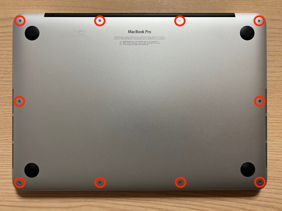 우선 맥북을 뒤집은 후, 다음의 10곳의 나사를 풀어야 합니다.