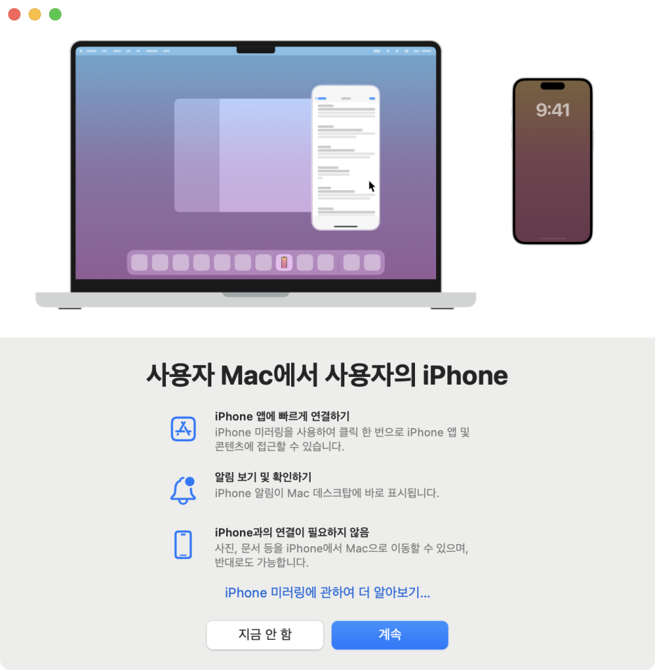 간단한 설명과 설정을 마치면 iPhone 미러링을 사용할 수 있습니다.