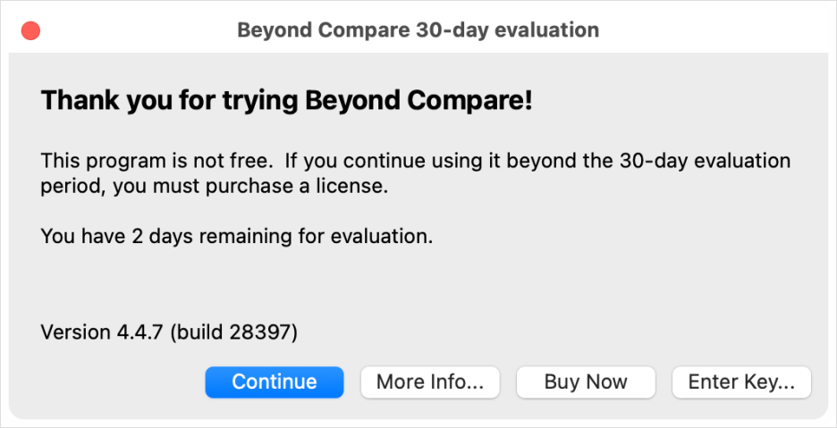이제 이렇게 시험판 기간이 끝나갈 즈음 되서 다시 리셋을 하면 Beyond Compare 4 for Mac을 영원히 사용할 수 있습니다.