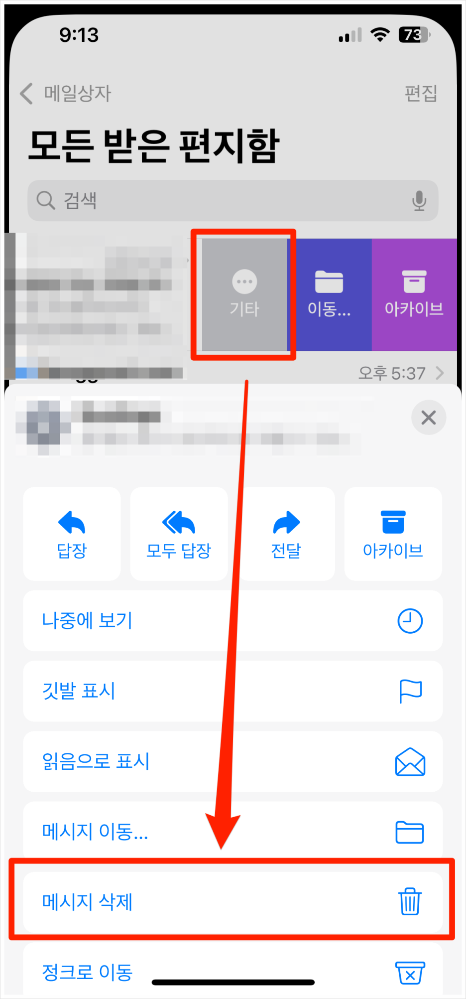 아래 처럼 왼쪽으로 스와이프 한 후 [기타 > 메시지 삭제]를 선택해야 합니다.