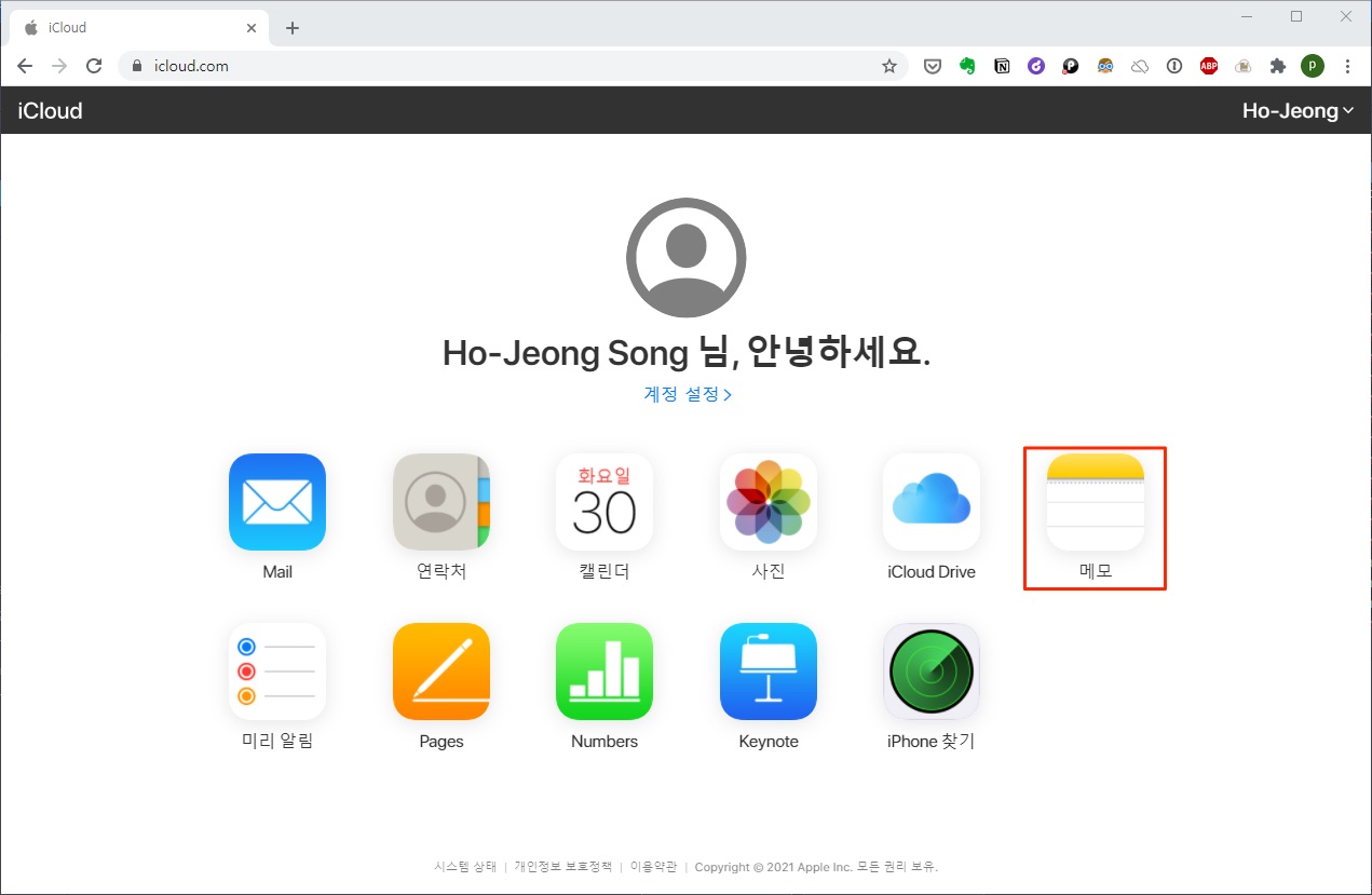 이 아이콘을 클릭하면 크롬 브라우저가 실행되고 아이클라우드 메모 사이트가 열리게 됩니다.