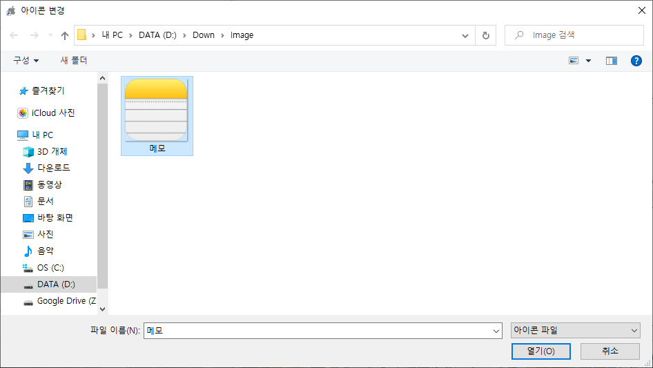 메모 아이콘을 선택합니다.(원하는 아이콘은 미리 준비해 주셔야 합니다.)