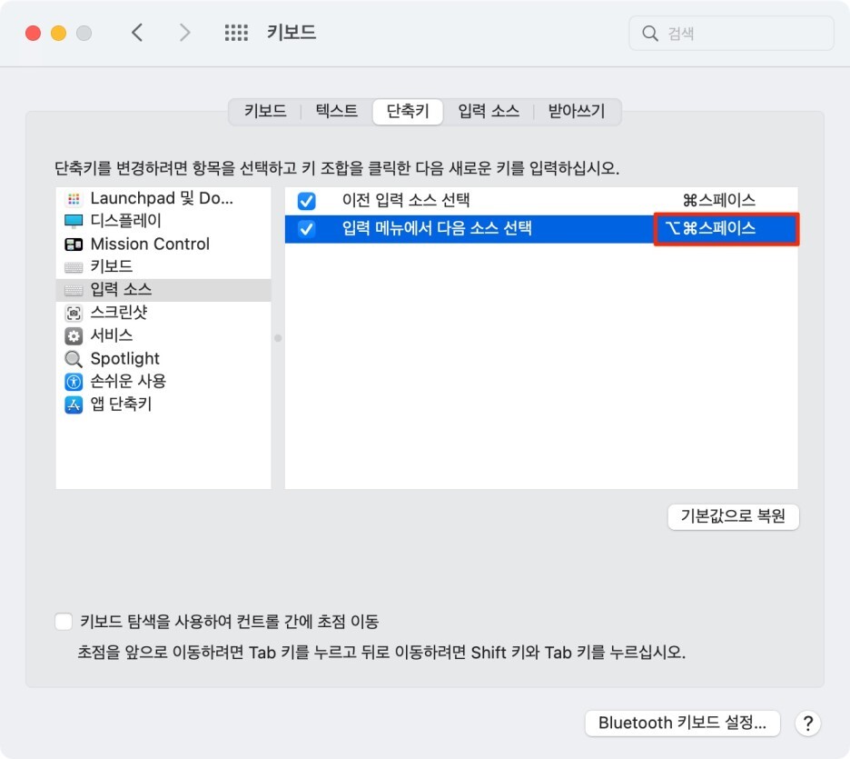 다음으로 아래의 '입력 메뉴에서 다음 소스 선택'을 선택 후 단축키를 Option+Cmd+Space로 변경합니다.