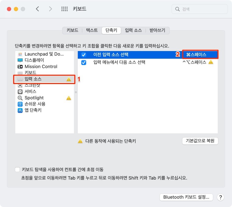 '이전 입력 소스 선택'을 선택하고 단축키를 Cmd+Space로 변경합니다. 이제 옆의 경고 표시가 사라졌습니다.
